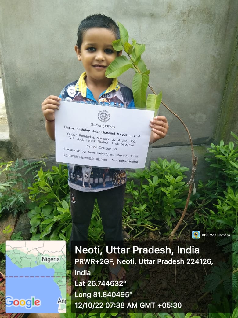 Occasion/Comment: I would like to plant the Guava tree on my Daughter’s Birthday 19th Oct which is always a special day for me. I would like to ... Read More I would like to plant the Guava tree on my Daughter’s Birthday 19th Oct which is always a special day for me. I would like to convey my sincere thanks to all Volunteers & Organizers for this wonderful initiative. Highly appreciate the objective of bridging the Urban & Rural gap through this program. I pray to God to provide good health & great success to all who are involved in this program. ... Less